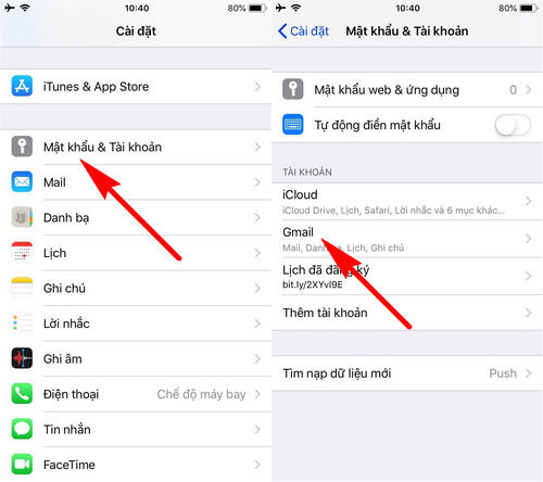 • Bước 3: Quay trở lại màn hình cài đặt, các bạn sẽ ấn chọn mục Tài khoản & Mật khẩu và lựa chọn tài khoản Gmail như hình dưới.