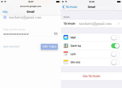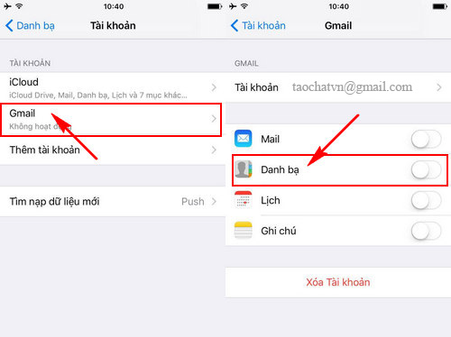 • Bước 2: Tiếp đó, các bạn lựa chọn tài khoản Gmail để có thể thực hiện đồng bộ danh bạ iPhone lên Gmail, và kích hoạt tính năng Danh bạ (Contacts).
