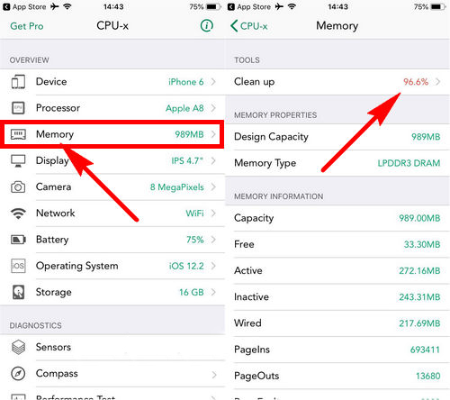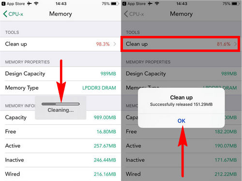 - Bước 2: Sau đó, các bạn sẽ khởi động ứng dụng CPU-x, tại giao diện chính ứng dụng này để có thể tăng tốc iPhone các bạn sẽ ấn chọn mục Memory và ấn chọn Clean up như hình dưới.