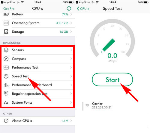 - Bước 4: Bên cạnh việc tăng tốc iPhone bằng CPU-x, tăng tốc độ và dọn dẹp RAM. Ứng dụng này còn cung cấp các dịch vụ hỗ trợ kiểm tra thiết bị khác như kiểm tra tốc độ kết nối mạng internet bằng cách ấn chọn mục Speed và chọn Start để bắt đầu.
