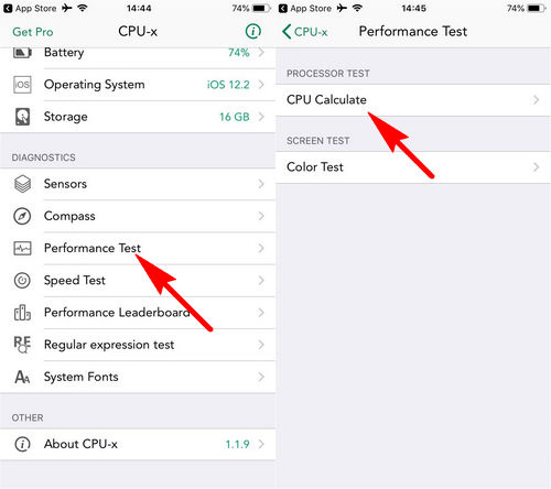 - Bước 5: Hay như để có thể kiểm tra hiệu năng iPhone mà các bạn có ổn định hay không sau một thời gian sử dụng, các bạn sẽ ấn chọn mục Performance Test. Sau đó, ấn chọn mục CPU Calculate.