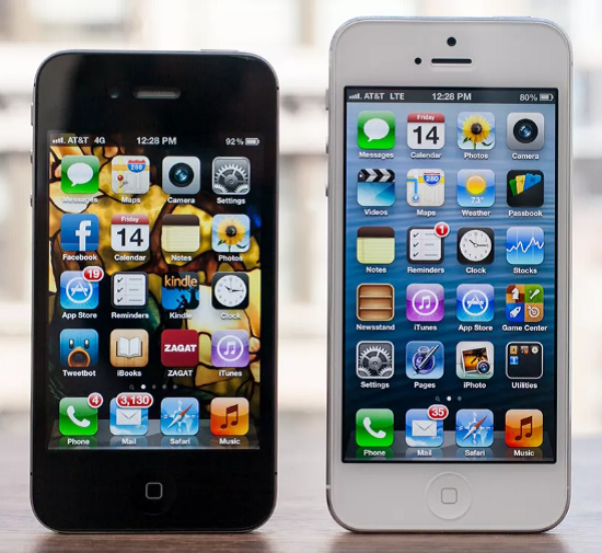 • 4. iPhone 5: iPhone 5 trông giống iPhone 4, tuy nhiên cao hơn iPhone 4, chứa đến 6 dòng ứng dụng, trong khi iPhone 4 chỉ có 4 dòng ứng dụng hiển thị trên màn hình.