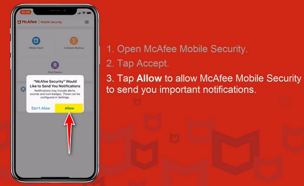 - Tiếp theo đó, tiến hành cấp quyền cho ứng dụng truy cập trên thiết bị. Nhấn Allow để cho phép ứng dụng McAfee McAfee Mobile Security gửi các thông báo quan trọng đến bạn.
