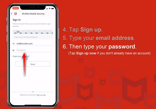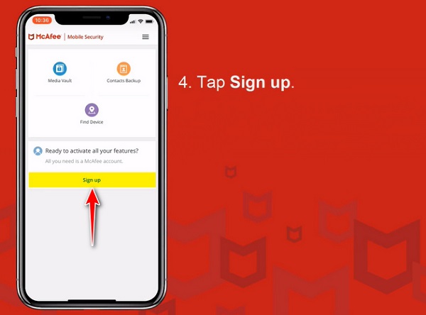 - Bước 3: Tại giao diện chính của ứng dụng McAfee Mobile Security, các bạn nhấn Sign up để tiến hành đăng ký tài khoản.