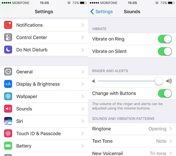 - Cũng không ngoại trừ ai đó mượn máy hoặc bạn vô tình thiết lập âm lượng của chuông về chế độ Mute. Để chắc chắn các bạn có thể truy cập vào Settings (Cài đặt) ->Sound (Âm thanh) và kéo thanh âm lượng của chuông sang chế độ MAX để kiểm tra.