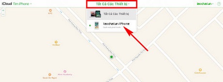 Bước 4: Hệ thống sẽ hiển thị bản đồ cũng như vị trí hiện tại thiết bị đã được đăng nhập bằng iCloud này, các bạn ấn chọn Tất cả các thiết bị và lựa chọn iPhone.