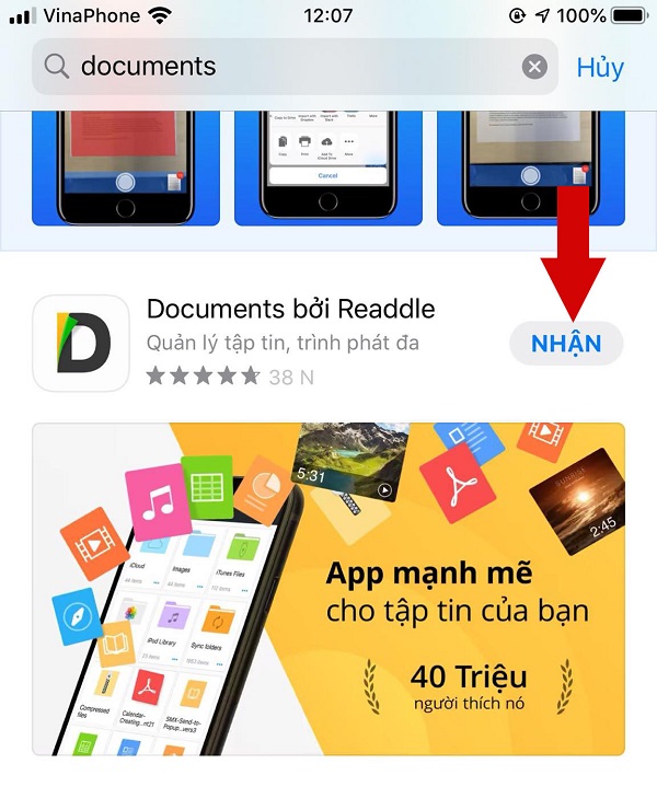 • Bước 1: Tải và mở ứng dụng Documents (Lưu ý: Để được tải miến phí đòi hỏi iPhone của bạn phải ở phiên bản iOS 11. Mặc khác, để thực hiện bước này bạn cần có sẵn iCloud trên máy để tiện lưu file nhạc).