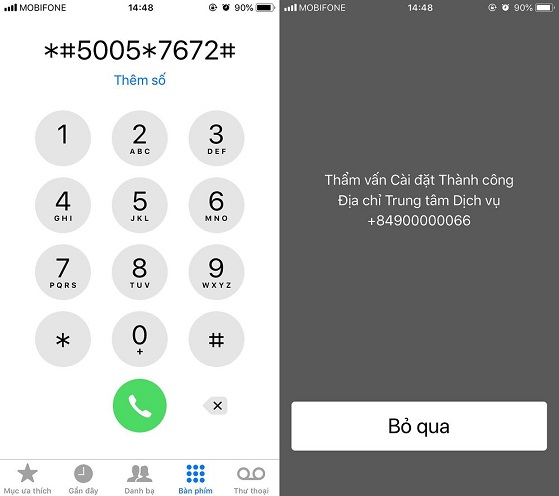 - Nếu không đúng, người dùng có thể thiết lập lại bằng cách nhập **5005*7672*<số trung tâm dịch vụ ở trên># rồi nhấn Gọi. Ví dụ cho nhà mạng Viettel sẽ là **5005*7672*84980200030#.
