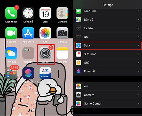 - Bước 1: Đầu tiên, các bạn chỉ cần vào cài đặt -> tìm tab Safari