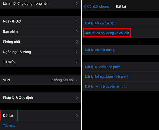 - Bước 2: Ấn chọn Đặt lại -> Xóa tất cả các nội dung và cài đặt