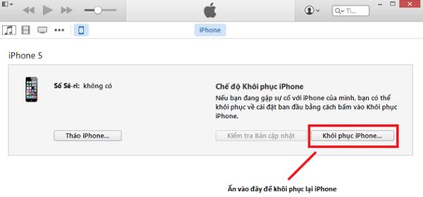 - Bước 4: Chọn Restore (khôi phục), làm theo chỉ dẫn của iTunes để khôi phục lại máy.